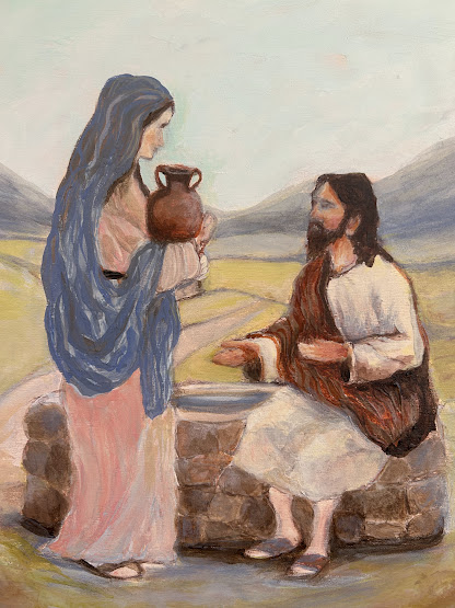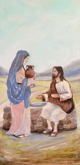 $175. Woman At The Well 15″ h x 7″w acrylic on cradled wood. A loose painting of Jesus when he encounters the Woman at the Well.